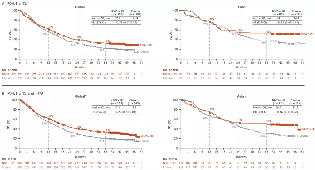 经过最短37.7 个月的随访,在PD-L1≥1%人群中,双免疫组和化疗组的中位OS分别为未达到 vs. 24.8个月(HR=0.72, 95%CI 0.47-1.11), 3年OS率分别为53% vs. 37%。在所有随机分组的亚洲患者(包括PD-L1≥1%和<1%)中,中位OS分别为36.2 vs. 22.9个月(HR=0.66,95%CI:0.48-0.92),3年OS率分别为51% vs. 31%。双免疫方案的生存获益优于传统化疗,与全球人群的研究结果一致。
