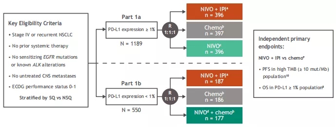 CheckMate-227是非小细胞肺癌(NSCLC)随访时间最长的III期一线免疫联合研究。该研究主要目的为探索晚期NSCLC中不同PD-L1表达人群Nivo+ipi双免疫联合对比化疗的疗效,此外,PD-L1≥1%人群还设置了Nivo单药组,PD-L1<1%人群还设置了Nivo+化疗组。主要终点为选择人群中Nivo+ipi对比化疗的疗效,包括高TMB人群的PFS, 和PD-L1≥1%人群的OS。该研究已于2019年ESMO公布达到了OS的主要终点,2020年5月FDA批准Nivo+ipi用于PD-L1≥1%的EGFR/ALK阴性IV期或复发的NSCLC初治患者。