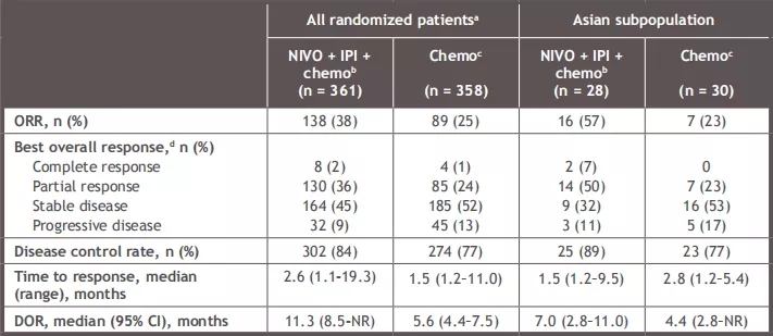 而此次公布的亚裔患者数据显示,亚洲亚组共计245例患者,分别有121例、124例随机至Nivo+ipi组和化疗组。数据显示: