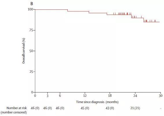 在修正的ITT人群中,12个月PFS率为95.7%,18个月PFS率为87%,24个月的PFS率为77.1%,符合方案集人群中,12个月、18个月和24个月的PFS率分别为100%、91.9%和87.9%(图2)。