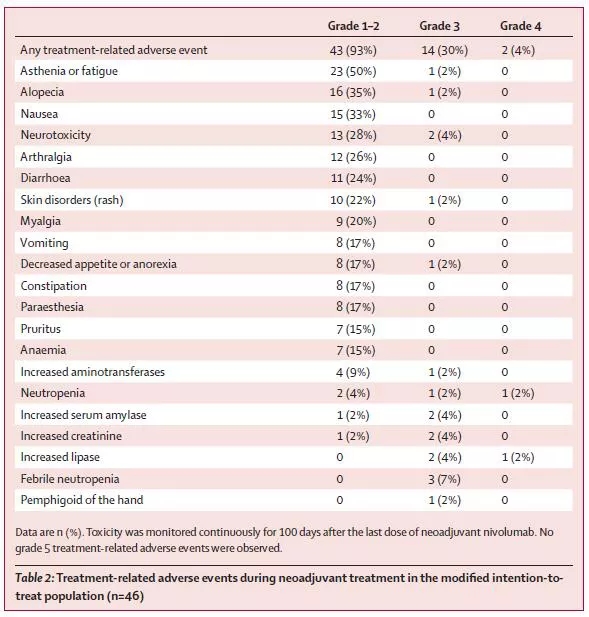 事后分析未发现临床病理特点和PFS的相关性,93%的患者出现新辅助治疗相关的不良反应,其中3度及以上不良反应发生率为30%,最常见的1~2度治疗相关不良反应为疲乏50%、恶心33%、中性粒细胞下降28%、腹泻24%、皮疹22%。最常见的3度及以上不良反应发生率包括脂肪酶升高7%,粒细胞下降7%等。在新辅助治疗阶段无不良反应导致治疗中止、手术延迟或死亡。然而,有7%的患者因不良反应导致未能接受Nivolumab的术后辅助治疗。事后分析未发现PFS和不良反应之间的相关性,在术后辅助治疗阶段,14%的患者因不良反应导致治疗终止(图4)。