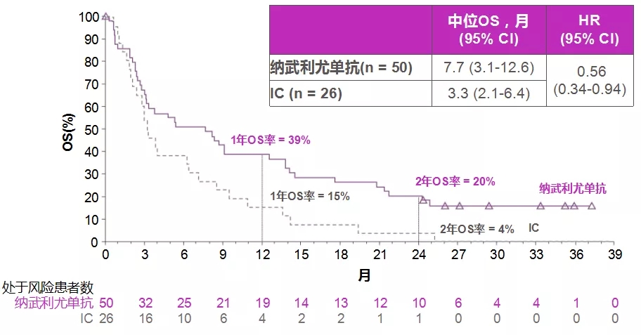 与CR/ORR和DoR获益相对应的是无进展生存(PFS)获益,纳武利尤单抗组和对照组的中位PFS数据相当;1年PFS率分别为17%和8%;2年PFS率分别为15%和0%。