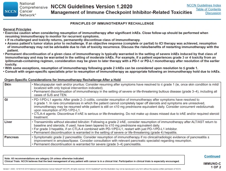 除此之外,NCCN指南2020年V1版对关于irAE停药后再次使用免疫治疗做了如下推荐,主要原则坚持密切随访,监测复发症状,对于既往发生重度irAE或重复发生irAE的ICIs应永久停止使用。