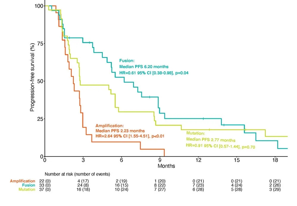 与FGFR融合和突变的患者相比,FGFR扩增患者的无进展生存期(PFS)更短;FGFR扩增组患者的中位PFS为2.23个月,而其他类型患者总体的中位PFS评估为5.23个月(危险比[HR] 2.64, 95%可信区间[CI] 1.55-4.51; p<0.01);