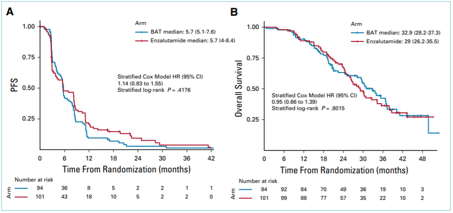 该研究共入组195例经阿比特龙治疗发生进展的CRPC患者,随机分为BAT组(n=94)和恩扎卢胺组(n=101)。主要终点为临床或影像学无进展生存期(PFS);进展期允许交叉。次要终点包括总生存期(OS)、无PSA进展生存(PSA-PFS)、客观缓解率(ORR)、随机交叉(PFS2)的PFS、安全性和生活质量(QoL)。