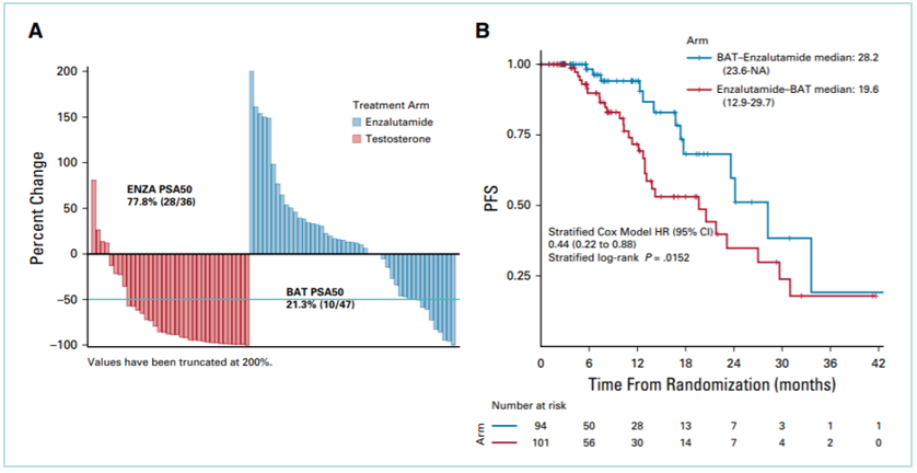 BAT组和恩扎卢胺组的PSA50缓解率(PSA下降50%的患者比例)无显著差异,分别为28.2%和25.3%;但恩扎卢胺组的PSA-PFS优于BAT组(2.8 vs 3.8个月;HR 1.51,95%CI:1.06~2.16;P=0.02),而BAT组的ORR高于恩扎卢胺组(24.2% vs 4.2%,P=0.07)。