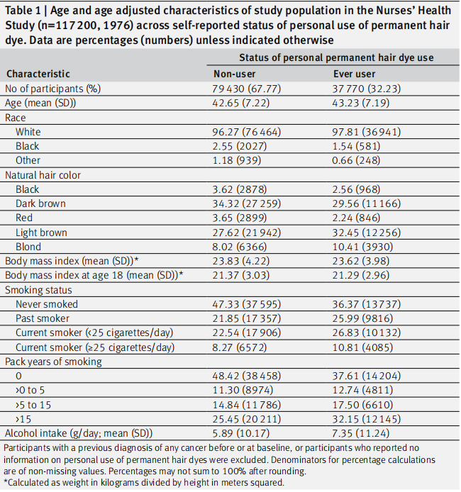 Zhang, Yin et al. “Personal use of permanent hair dyes and cancer risk and mortality in US women: prospective cohort study.” BMJ (Clinical research ed.) vol. 370 m2942. 2 Sep. 2020, doi:10.1136/bmj.m2942