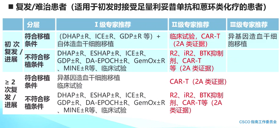 原发睾丸弥漫性大B细胞淋巴瘤的治疗:初治患者中,ⅠE/ⅡE期患者Ⅰ级专家推荐为根治性睾丸切除术联合R-CHOP方案,以及对侧阴囊预防性放疗。此外也积极推荐患者进行CNS预防,如鞘内注射甲氨蝶呤±阿糖胞苷,或静脉给予大剂量甲氨蝶呤化疗(2个疗程)。对于Ⅲ/Ⅳ期原发睾丸弥漫性大B细胞淋巴瘤的治疗目前还是类同于普通DLBCL的治疗,并且同样特别强调进行CNS预防。