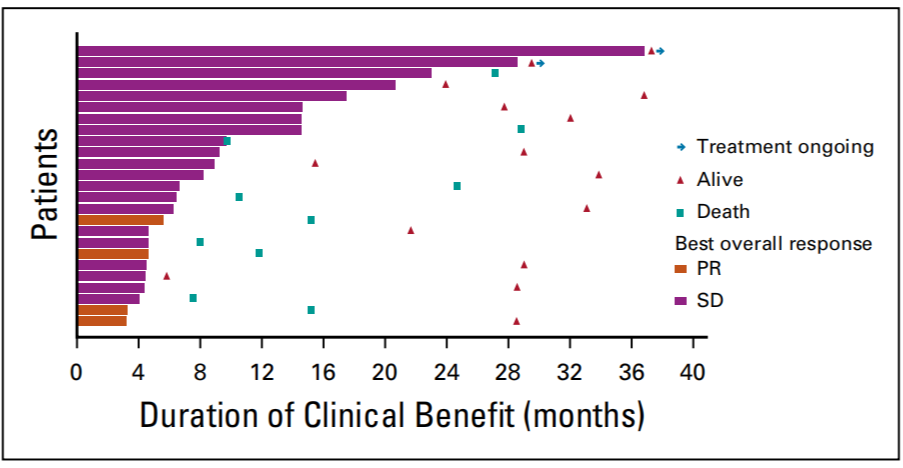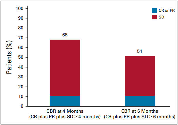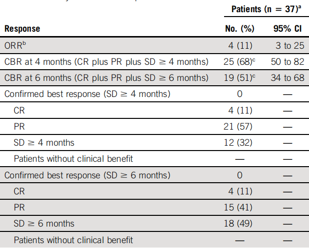 研究结果表明,中位随访4.5个月(0.3~37.3)期间,37例患者终止治疗。其中最常见的原因为CNS进展(27例);有2例患者仍在治疗,疾病稳定持续时间>2年。患者的CNS ORR为11%(4/37, 95%CI:3~25),其中4例患者为部分缓解(中位缓解持续时间为4.6个月)。患者4个月和6个月的临床获益率分别为68%和51%。