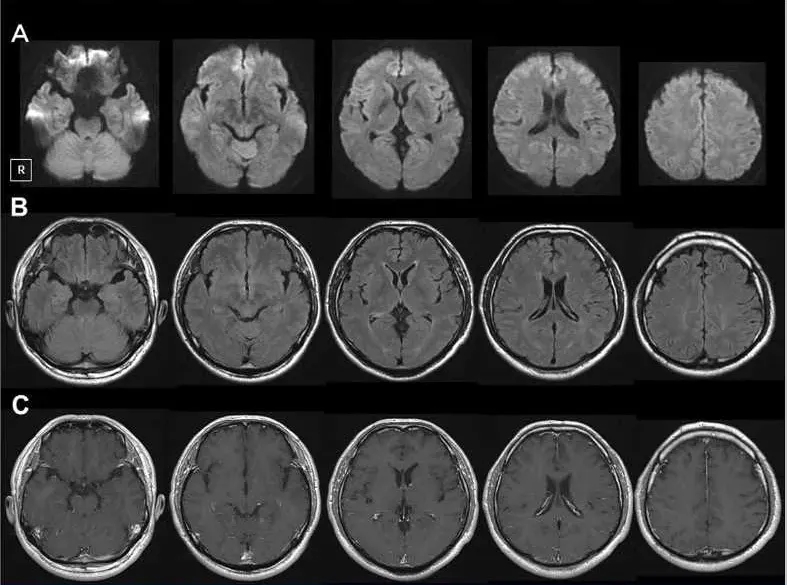 17天前,患者针对转移性肺腺癌接受了PD-L1抑制剂atezolizumab的首次治疗。入院前约1周出现发热。神经系统检查显示意识障碍(格拉斯哥昏迷量表E3V3M6)和运动性失语;没有表现出锥体束受累、不自主运动、共济失调、感觉障碍或自主神经障碍的迹象;没有发现其他异常(包括颈部僵硬)。