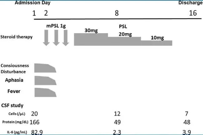 图2. 本病例的临床进程:CSF脑脊液;IL-6白介素6;mPSL甲基泼尼松龙;PSL泼尼松龙