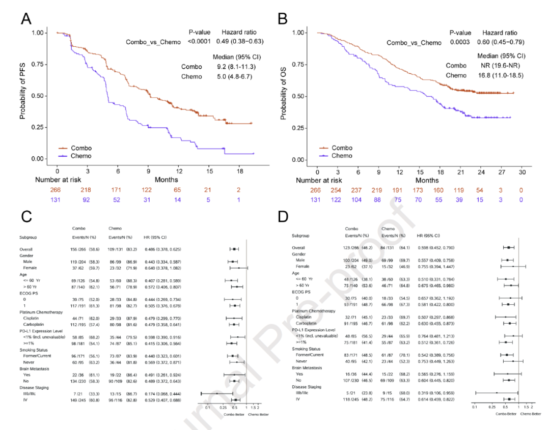 两组分别有82.2%和95.6%的患者出现PFS事件,两组中位PFS分别为9.0个月和4.9个月,HR=0.49,24个月PFS率分别为22%和3.4%。不同临床病理特点的患者均观察到了获益;两组ORR分别为48.3%和19.9%,无论PD-L1表达水平,ORR均有提高,中位DOR分别为12.5个月和7.1个月,24个月时仍然有响应的患者比例分别为28.4%和9.9%;两组中位PFS2分别为17.0个月和9.0个月,HR=0.50,24个月的PFS2率分别为38.2%和16.2%。