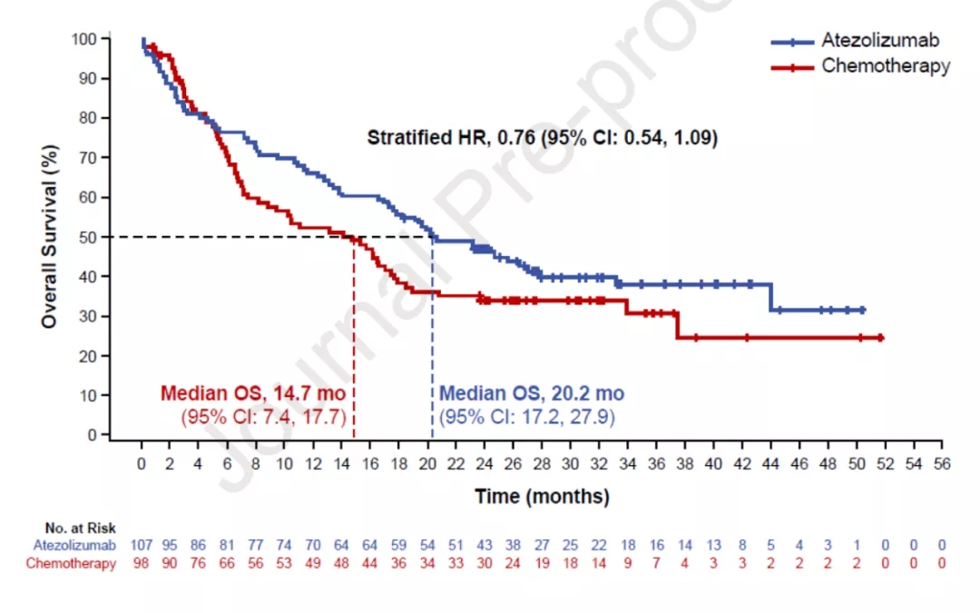 在PD-L1高表达患者中,阿替利珠单抗较化疗可改善患者OS,但是在PD-L1中-高表达患者中,未能观察到这种获益。研究支持阿替利珠单抗作为突变阴性、PD-L1高表达患者的一线治疗。