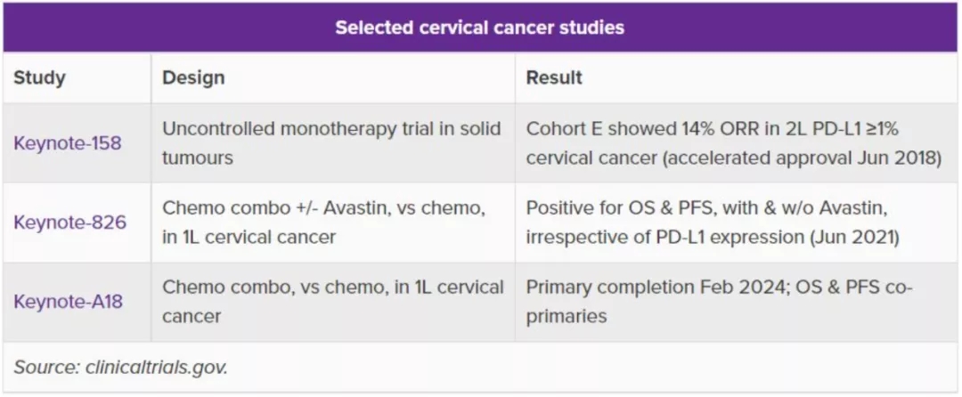 与其他癌种的研究策略相似,在关键3期KEYNOTE-826研究中,帕博利珠单抗联合化疗(且±贝伐珠单抗)以继续扩大和前移适应症,用于一线治疗、且不用考虑PD-L1表达状态。2021年6月22日,MSD宣布该研究达到了OS和PFS的主要终点,成为第一个宫颈癌PD-1/PD-L1一线治疗获得阳性结果的3期试验。另一项联合化疗的KEYNOTE-A18研究也在进行中。