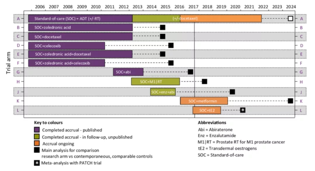 目前,STAMPEDE研究已经发表的研究包括标准疗法(SOC)ADT±放疗、SOC+唑来膦酸、SOC+多西他赛、SOC+塞来昔布、SOC+唑来膦酸+多西他赛、SOC+唑来膦酸+塞来昔布、SOC+阿比特龙等6组研究。