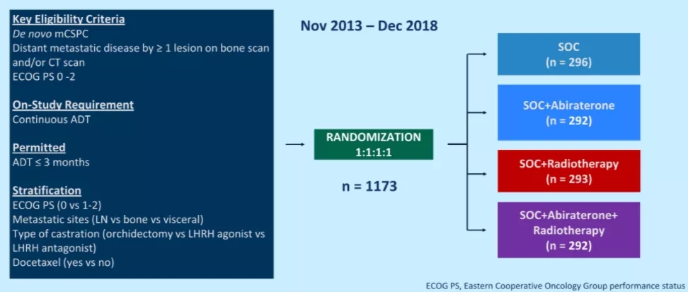 PEACE-1是一项采用2x2析因设计的3期试验,旨在探讨对于转移性去势敏感性前列腺癌(mCSPC)患者,在标准治疗(SOC)基础上联合阿比特龙或者放疗能否进一步改善患者生存。