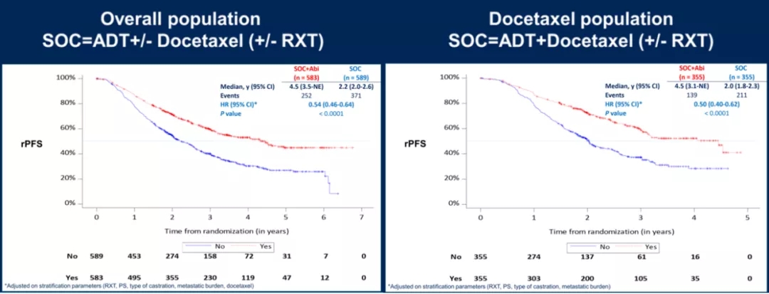 2021年ASCO大会报道了PEACE-1研究中SOC+阿比特龙的rPFS结果,相较于SOC方案,ADT+阿比特龙可降低46%的影像学进展或死亡风险(rPFS:2.2 vs 4.5年;HR 0.54,95%CI:0.46~0.64,P<0.0001),ADT+多西他赛+阿比特龙则可降低50%的影像学进展或死亡风险(rPFS:2.0 vs 4.5年;HR 0.50,95%CI:0.40~0.62,P<0.0001)。