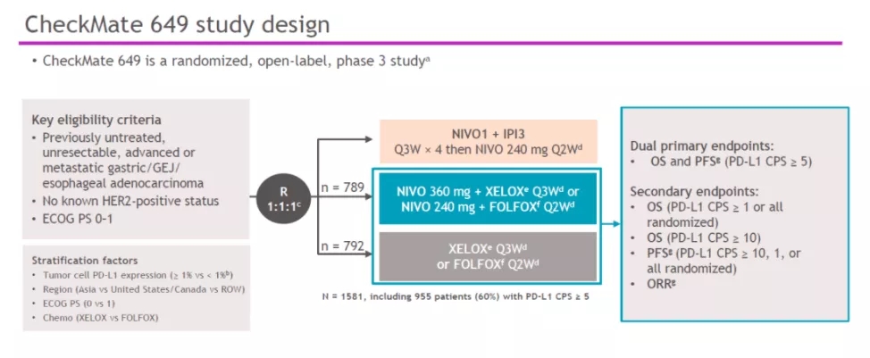 CheckMate 649是迄今为止GC/GEJC/EAC领域规模最大的全球III研究,纳入了全球176个研究中心的2031例患者(中国人群占13.4%)。该研究包括“单免(NIVO)+化疗”和“双免(NIVO+IPI)+化疗”两个试验组以及一个化疗对照组。