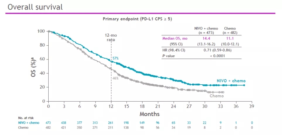 去年ESMO大会报道的结果显示,NIVO+化疗相较于单独化疗可显著改善PD-L1 CPS≥5患者PFS(7.7 vs 6.0个月,HR 0.68)和OS(14.4 vs 11.1个月,HR 0.71),PD-L1 CPS≥1患者OS(13.8 vs 11.6个月,HR 0.80)也同样有获益。