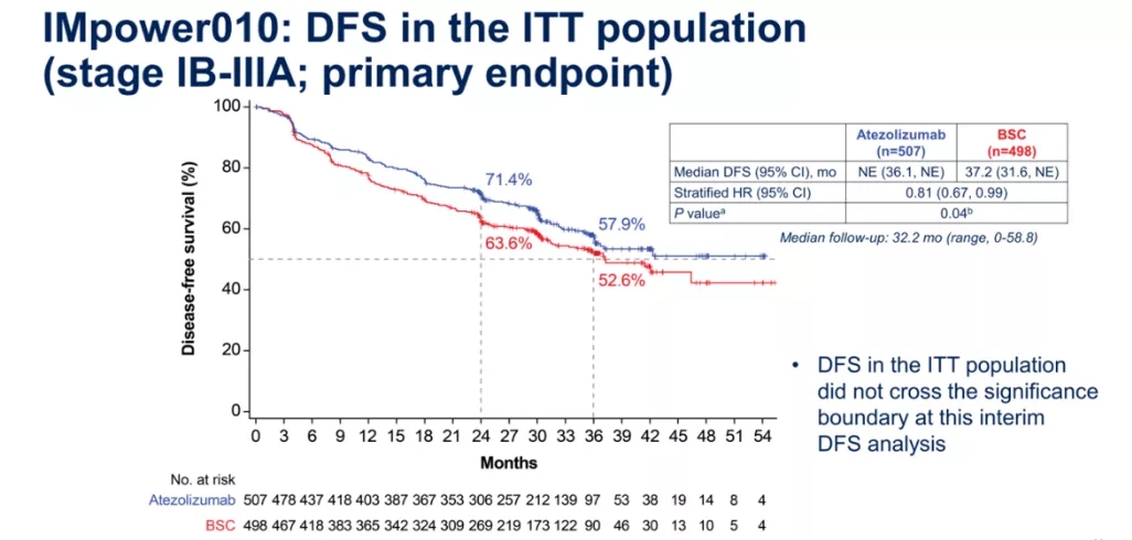 IMpower010是一项全球多中心、开放标签、随机Ⅲ期研究,共入组1280例完全性切除的IB(≥4cm)~IIIA期(UICC第7版)NSCLC患者,给予4个周期含铂化疗后,分别接受16个周期的阿替利珠单抗(1200mg,Q3W)或最佳支持治疗(BSC)。