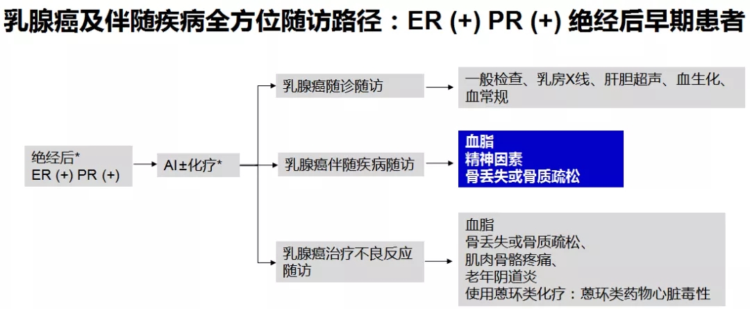 患者自然绝经或者OFS及AI等内分泌治疗会导致雌激素水平下降,易引发血脂异常、心血管疾病、骨代谢异常等伴随疾病或状态,也易出现焦虑抑郁等心理问题。患者自身因素及治疗引起的伴随疾病,不仅影响到患者的生活质量,甚至转化为疾病复发和死亡风险。因此,HR+早期乳腺癌患者的随访还应增加伴随疾病和治疗不良反应相关的检查项目,重点关注血脂异常、骨丢失或骨质疏松等问题,卵巢功能抑制治疗的患者还需监测雌激素水平是否维持在绝经后水平。