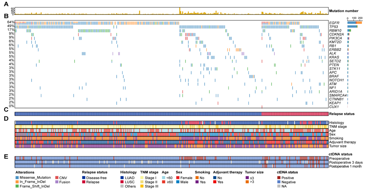 (A)肿瘤组织中的体细胞突变数。(B)肿瘤组织中频繁突变的驱动基因。(C)患者的复发情况。(D)患者的临床病理特征。(E)术前、术后3天和术后1个月检测ctDNA状态。