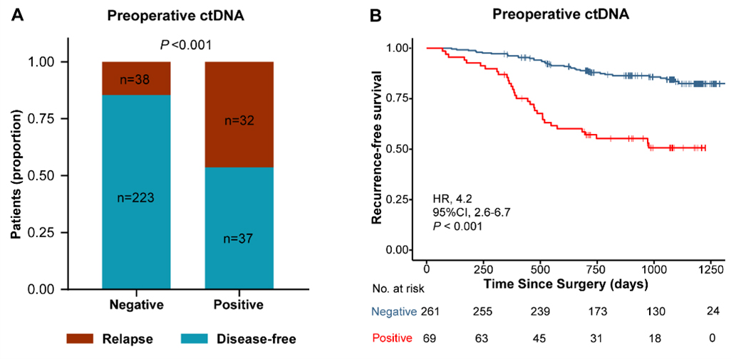 (B)Kaplan-Meier曲线展示根据术前ctDNA状态分层的RFS。