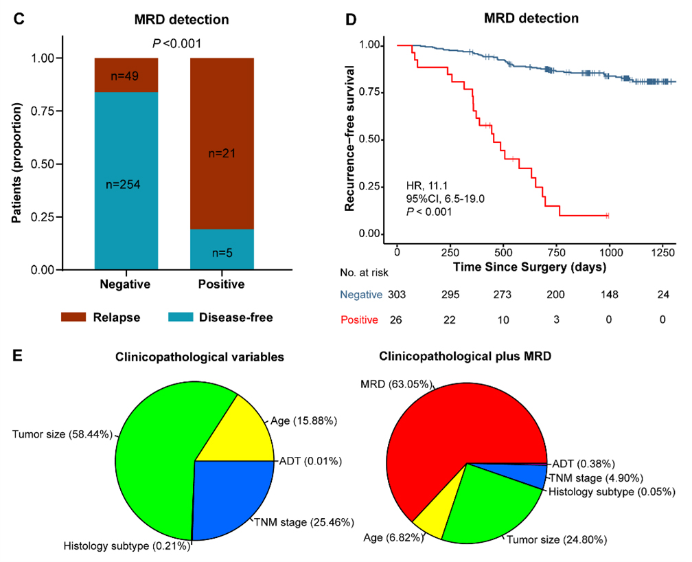 (C)比较基于ctDNA的MRD阴性患者和MRD阳性患者的总复发率。(D)Kaplan-Meier曲线显示根据基于ctDNA的MRD状态分层的RFS。(E)多因素Cox分析,临床病理变量(左)和临床病理变量加上基于ctDNA的MRD(右)的每个参数对RFS预测的相对贡献。