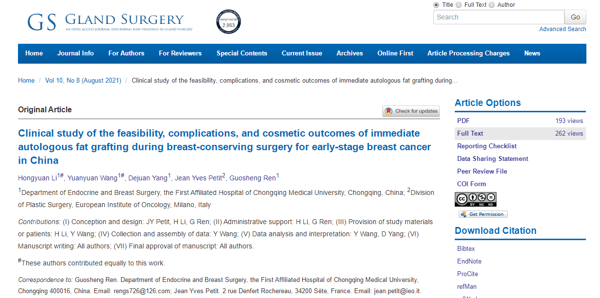 日前,重庆医科大学附属第一医院厉红元/任国胜教授团队开展的早期乳腺癌保乳术联合即刻脂肪移植技术的相关研究发表于《Gland Surgery》杂志,现就该项研究进行介绍。
