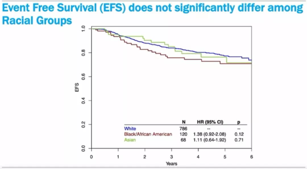 在不同分子亚型的Non-pCR患者中,只有HR+/HER2-患者存在EFS种族差异,黑人/非裔美国人的复发风险比白人患者更高(EFS HR 1.9,P=0.04),而TNBC、HR+/HER2+、HR-/HER2+患者不存在EFS种族差异。