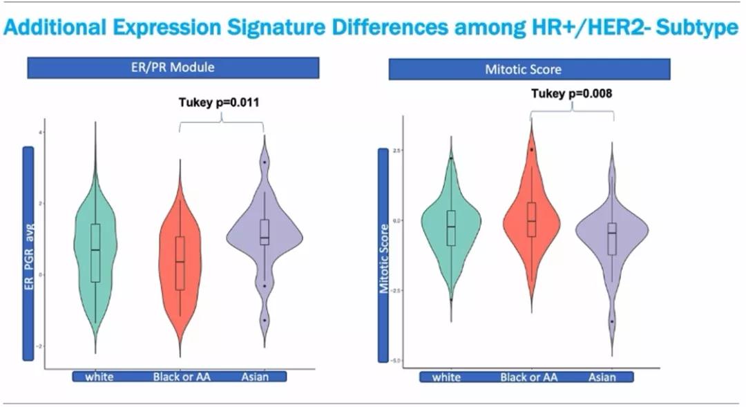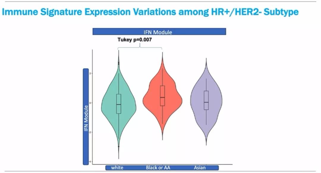 研究人员进一步分析了评估了患者28种免疫相关基因表达的差异。结果显示在HR+/HER2-亚型中,黑人或非裔美国人患者在IFN模块中的免疫基因表达变异显著高于白人患者(P=0.007),黑人或非裔美国人较亚裔,ER基因表达下调,而有丝分裂评分基因表达增高。