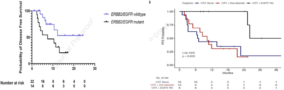 在突变阳性的患者中,已经有部分研究开始探索同步靶放疗的疗效及安全性并得到出色的结果。中国学者做的一项小型随机对照研究发现,同步放化疗和同步靶放疗患者的中位PFS分别为24.5个月和9.0个月(HR=0.10),OS尚不成熟;而JTO杂志发表的一项日本学者进行的小样本单臂研究发现,对于不可手术的局部晚期且携带EGFR敏感突变的NSCLC患者,给予同步靶放疗(吉非替尼联合标准剂量放疗)可较历史数据显著改善患者预后,27例患者的中位PFS为18.6个月,2年PFS率为29.6%,中位OS达到61.1个月,已经超过PACIFIC研究中位48个月左右的OS数据。