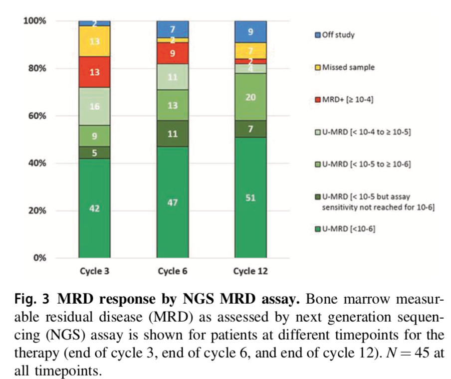 45例患者对于进行了二代测序(NGS)的MRD监测。NGS技术敏感性可达10-6,限于样本及实际检测限制,部分检测敏感性为10-5。12周期治疗后,38/45例患者可获得骨髓样本进行NGS MRD检测(4例退出,3例样本丢失)。23/38例(61%)患者获得了U-MRD(10-6);另外3/38例获得U-MRD(10-5)。(图3)
