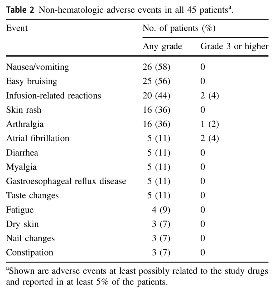 44/45名患者完成3周期iFCG方案。总体上,共43%患者因骨髓抑制原因在治疗期间减低FC剂量。未预防性使用G-CSF的患者中,FC减量的发生率为59%。预防性使用G-CSF患者中FC减量的发生率为13%。Ibrutinib减量发生率为44%(20/45),原因包括骨髓抑制(n=9)、关节/肌肉痛(n=8)、房颤(n=3)、皮疹(n=2)。