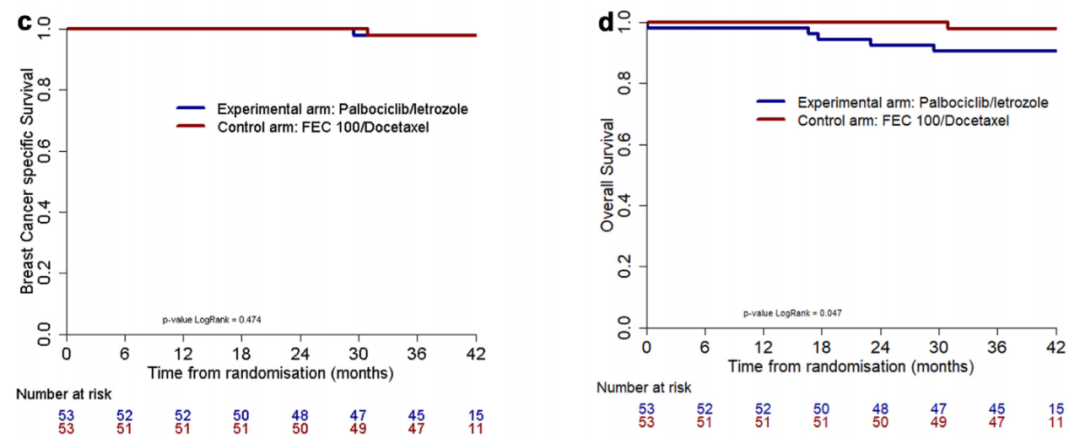 共观察到7例死亡,6例在来曲唑-帕博西林组,尽管OS获益倾向于化疗组(LogRank P=0.047),但来曲唑-帕博西林组仅有2例死于乳腺癌,其他4例死于子宫内膜癌、感染性休克、自杀、肝硬化。两组间的BCSS无显著差异(LogRank P=0.474)