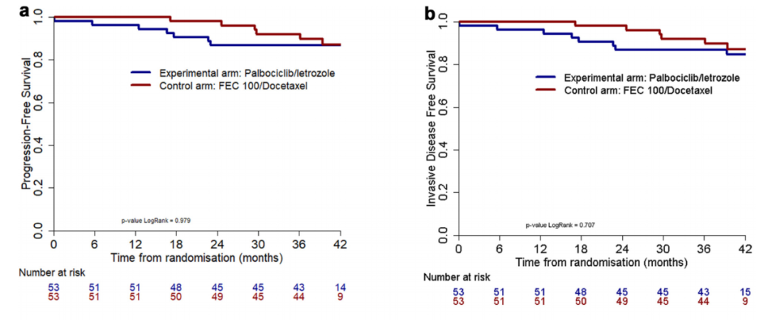 此次发表于EJC的论文,报道了中位随访40.4个月的生存数据[2]。共有11例患者发生进展,其中来曲唑+哌柏西利组3例,化疗组8例。两组间的PFS(HR 1.01;95%CI:0.36~2.90,P=0.98)和iDFS(HR 0.83;95%CI:0.31~2.23,P=0.71)没有显著差异。曲唑+哌柏西利组和化疗组的40个月PFS率分别为86.7%(95%CI:78.0~96.4)和89.9%(95%CI:81.8~98.7)。