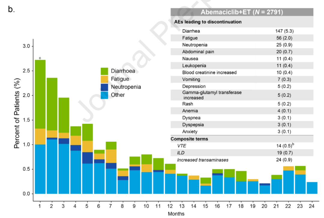 腹泻一般为轻度(1/2级:77%);2/3级AE发生率在治疗的第一个月内最高(20.5%),且持续时间短(≤7天),没有复发。阿贝西利+ET组的静脉血栓栓塞事件(VTE)发生率高于ET组(2.5% vs 0.6%);在阿贝西利组中,他莫昔芬相较于芳香化酶抑制剂的VTE风险更高(4.3% vs 1.8%)。