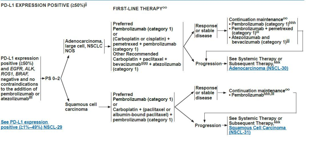 基于上述数据,指南在对这部分患者进行推荐的时候,相对更加倾向于推荐单药治疗。如在NCCN指南中,对于PD-L1≥50%患者,单药Pembrolizumab作为I类优先推荐;联合化疗同样作为I类推荐,但只是普通推荐,并不是作为优先推荐。