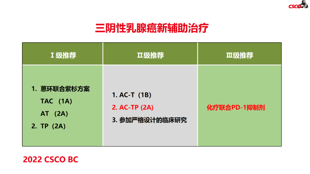 TNBC新辅助治疗仍以紫衫联合蒽环为主要推荐。但近年来,GeparSixto、NeoCART研究显示TNBC新辅助治疗加入铂类可提高pCR率,且获得pCR的患者可提高生存获益。因此,新版指南在II级推荐中新增AC-TP(2A)。KEYNOTE-522研究证实了化疗联合PD-1的pCR率和生存获益,但国内尚无适应症,所以指南将其作为III类推荐。