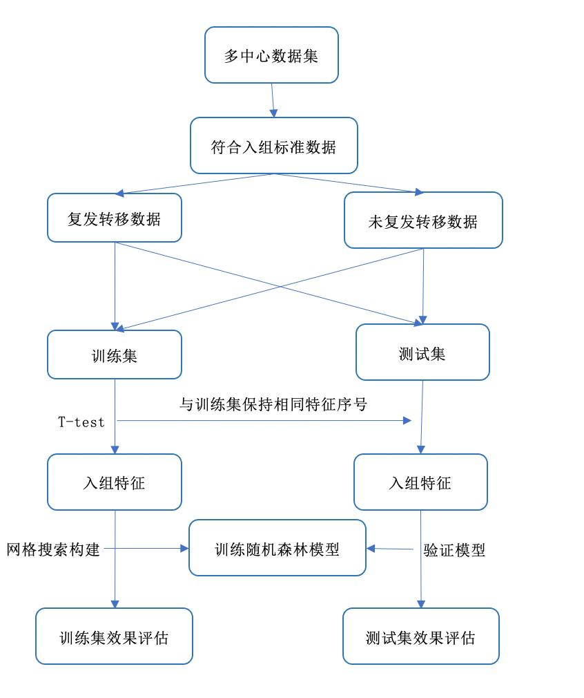 研究采用机器学习模型对506例HER2低阳性表达病例建立复发风险预测模型。t检验分析得到15个有效特征,包括T分期、N分期、TNM分期、组织学分级、血管肿瘤血栓、ER状态、PR状态、预后分期、Ki67指数(连续变量)、Ki67指数(分组变量)、化疗、新辅助化疗、乳房手术、腋窝手术、内分泌治疗(P<0.05),作为自变量纳入构建的模型中(表3)。