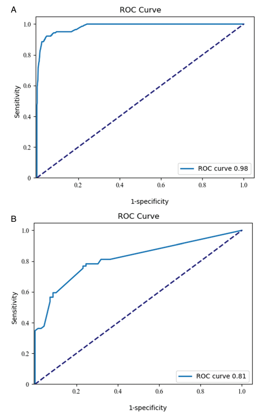 图4.HER2低阳性表达乳腺癌训练集和测试集5年复发风险模型的ROC曲线。(A)复发风险模型训练集的ROC曲线。(B)复发风险模型、检验集的ROC曲线。