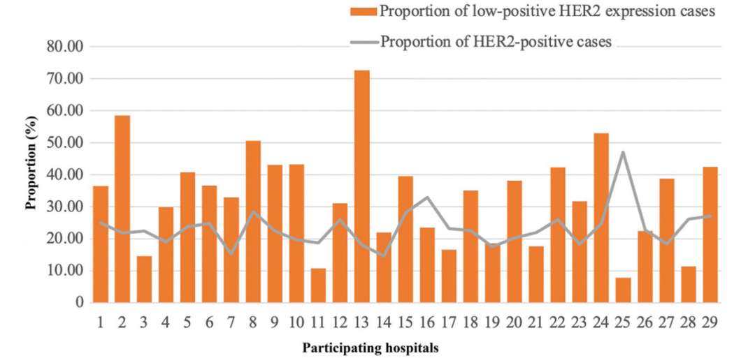 图3.参与医院HER2低阳性表达和HER2阳性病例患者比例