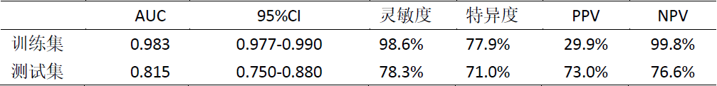 采用机器学习算法对数据进行预处理(表4)。发现随机森林模型可以有效地消除不相关因素,分析有效特征与预测值之间的相关性,识别数据的差异和共性。随机森林模型是最适合本研究的复发预测模型。训练集复发风险预测模型的AUC为0.983(95%CI:0.977~0.990),测试集AUC为0.815(95%CI:0.750~0.880)。5年复发风险预测模型对HER2低表达乳腺癌的敏感性为78.3%,特异性为71.0%,PPV为73.0%,NPV为76.6%(表5),表明该模型对早期HER2低表达乳腺癌的复发转移有一定的识别价值。该研究为HER2低表达早期乳腺癌细化分类治疗提供了新的参考。
