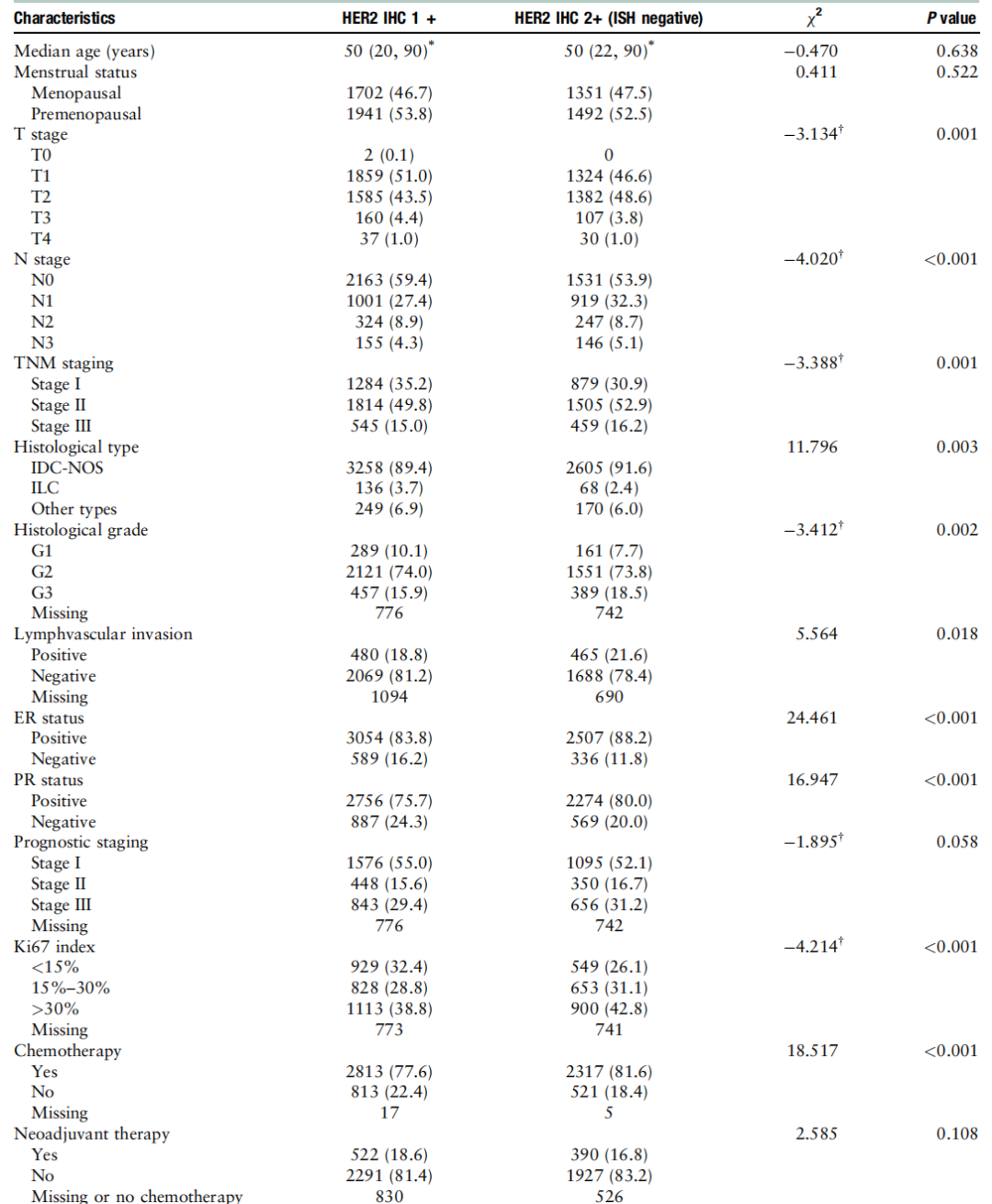 表1.HER2 IHC 1+和IHC 2+(ISH阴性)乳腺癌患者的临床病理资料
