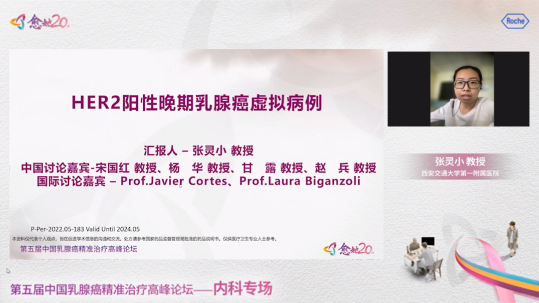 西安交通大学第一附属医院张灵小医生分享一例曲妥珠单抗单靶辅助治疗DFS37个月的HER2阳性晚期乳腺癌虚拟病例。随着虚拟病例预设的病情进展,西班牙巴塞罗那国际乳腺中心Prof. Javier Cortes、意大利普拉托医院“桑德罗·皮蒂格利亚尼”肿瘤中心的Prof. Laura Biganzoli、北京大学肿瘤医院宋国红教授、河北大学附属医院杨华教授、重庆医科大学附属第一医院甘露教授、新疆医科大学附属肿瘤医院赵兵教授对患者在帕妥珠单抗不可及时的一线治疗选择、可及后维持治疗是否更换为HP双靶、再次复发后PI3KCA突变时二线治疗策略以及采取具有ADCC效应药物序贯给患者总生存带来的影响进行了实战演练。