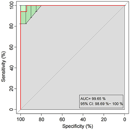 此外,依据20个肠道微生物细菌家族建立的受试者操作特征(ROC)曲线用于HCC-MVI预测的曲线下面积(AUC)为99.65%(95%CI:98.69%~100%)。