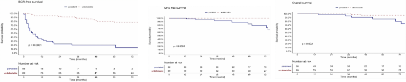 图1. PSA不可检测与PSA持续患者的无BCR生存率(左)、无转移生存率(中)和总生存率(右)