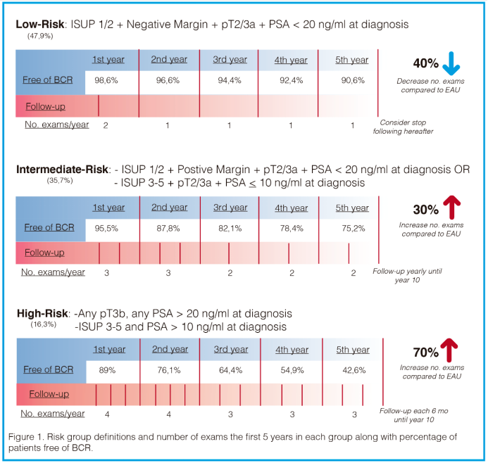 据报道,RP后20%-40%的患者出现BCR。虽然BCR的预后因素尚不清楚,但有部分风险因素与RP后的BCR风险、转移和生存相关。此外,早期检测BCR可改善挽救治疗。与大多数癌症不同,临床指南建议所有患者无论BCR风险和预后,RP后均检测PSA。本研究提出了一种基于肿瘤学结局的个体化、基于风险的RP后随访方案。