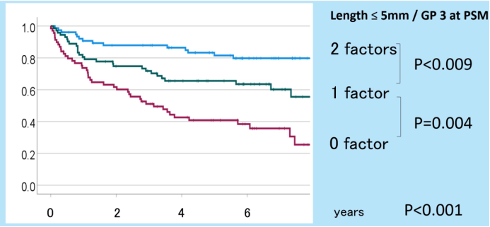 共377例患者出现阳性切缘,中位长度为5 mm。187例患者的阳性切缘位置仅在尖部,其余则为其他位置的单个或多个阳性切缘。单个阳性切缘293例(78%)。130例为GP3,214例为GP4,33例为GP5。GP3在仅尖部的阳性切缘中更常见。GP5、前列腺包膜外、精囊侵犯、IDC-P和阳性切缘在所有患者中均为BCR的显著预测因素。多因素分析显示,阳性切缘长度和GP是预后的显著强预测因素,强于位置和数量。手术切缘阳性的pT2患者的预后可根据长度和GP显著分为3组(P<0.001),详见图3。