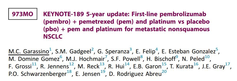 研究背景:III期KeyNote-189研究发现,Pembrolizumab联合培美曲塞及铂类显著改善了驱动基因突变阴性、初治、转移性非鳞、非小细胞肺癌患者预后,且无论患者PD-L1表达水平均可以从这一治疗中获益。本研究报道了该研究随访5年后的数据。